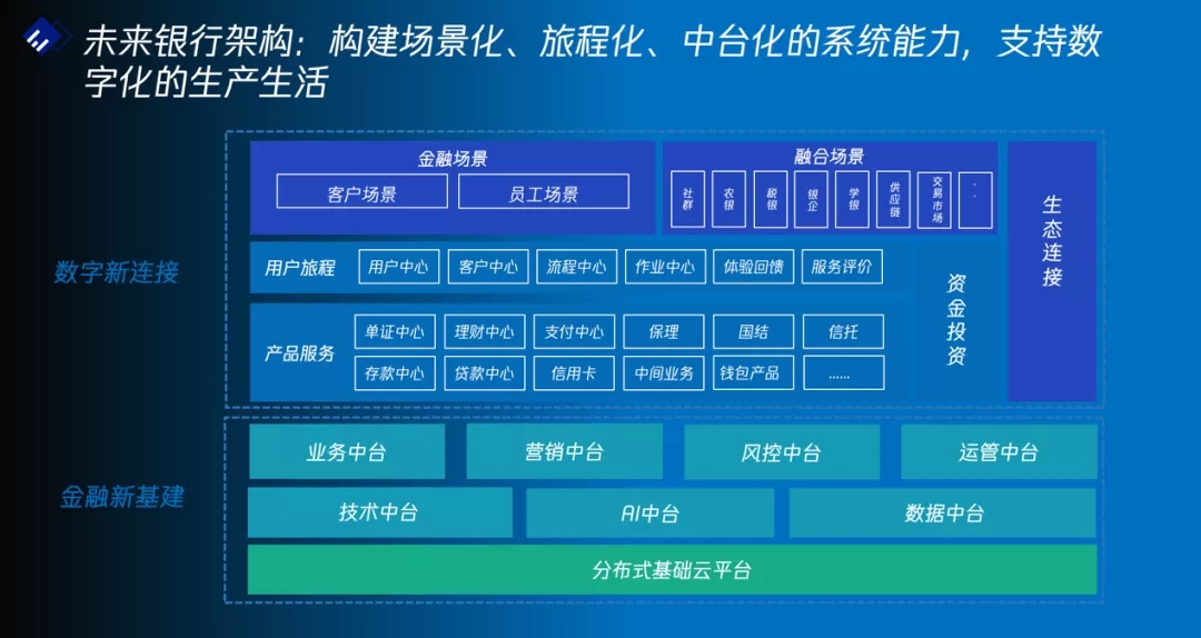 在银行数字化转型的能力支撑上,联合方案以神州信息未来银行架构ModelB@nk5.0为指引,来建设新基建和新连接两大层次的能力体系。通过金融新基建的三层体系,提供IT基础设施的分布式基础云平台层;提供数字化、智能化、分布式能力的数据中台、AI中台和技术中台层;提供金融基础支撑能力的业务中台、营销中台、风控中台和运管中台层,三个层次各个中台之间互相赋能,为上层的新连接能力奠定坚实基础。在数字新连接层,从场景端出发,通过差异化的产品服务、旅程式的用户服务来构建金融场景及融合场景,为用户提供智能化、数字化、旅程式的“场景+金融”的一体化服务。